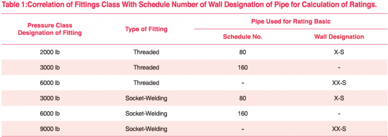 These fittings shall be designated as pressure class 2000, 3000 & 6000 fittings for threading and pressure class 3000, 6000 and 9000 for socket-welding. This designation identifies the fittings with their ratings as shown as follow: